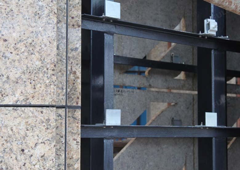 The stone cladding mechanical fixing method creates a cleft of around 30 to 45 mm in between face of the wall and stone covering, providing a layer of air cushion that acts as a thermal barrier. The appearance of stone used in dry cladding work looks spotless and aesthetically pleasing. It is a time saving procedure.